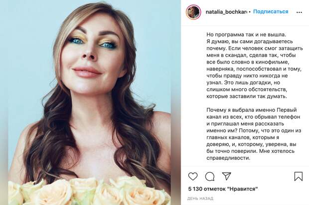 Бочкарёва утверждает, что ещё в феврале пришла на Первый канал, где и рассказала всё -- всю свою версию:
